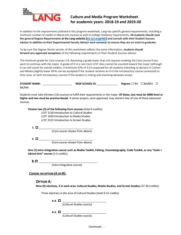 As of fall 2020, students declaring the major in Culture and Media at Lang must take 12 courses, outlined as follows. The minimum grade for Introductory courses is B. Receiving a grade lower than a B requires retaking the Introductory course if you want to continue